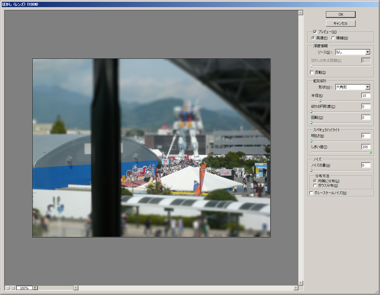 ツールバー>フィルタ>ぼかし>ぼかし(レンズ)